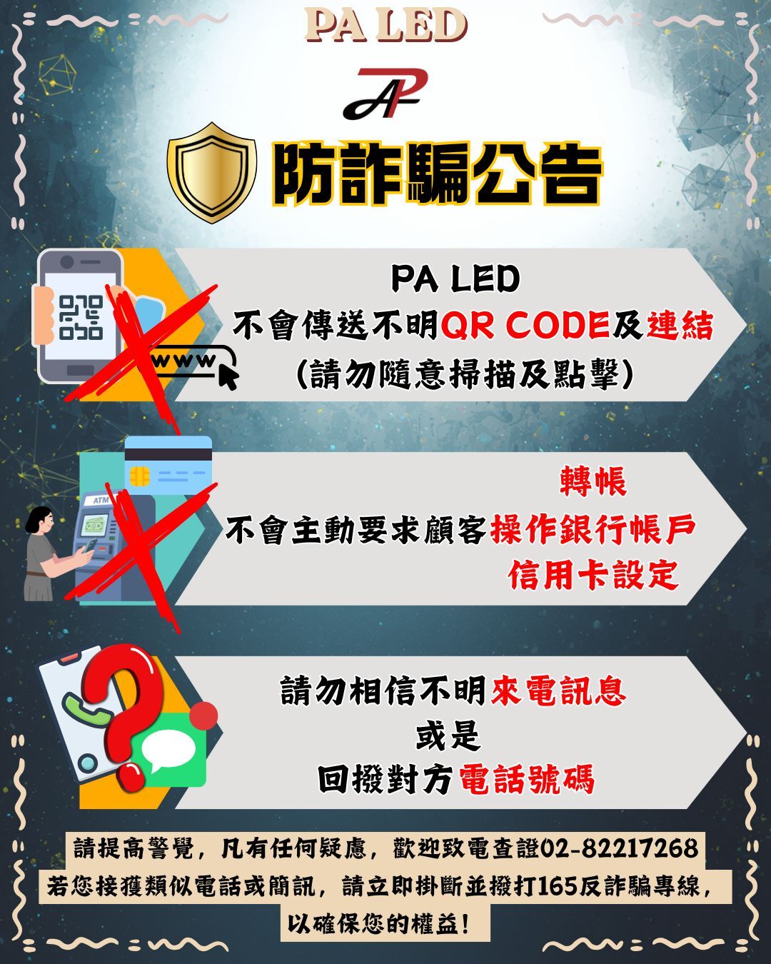 - 如果您接到相關電話或簡訊,請提高警覺,切勿輕信不明來電指示,若有疑慮,敬請於第一時間聯繫 PA LED 車用百貨 或撥打警政署 165 反詐騙專線進行確認。
