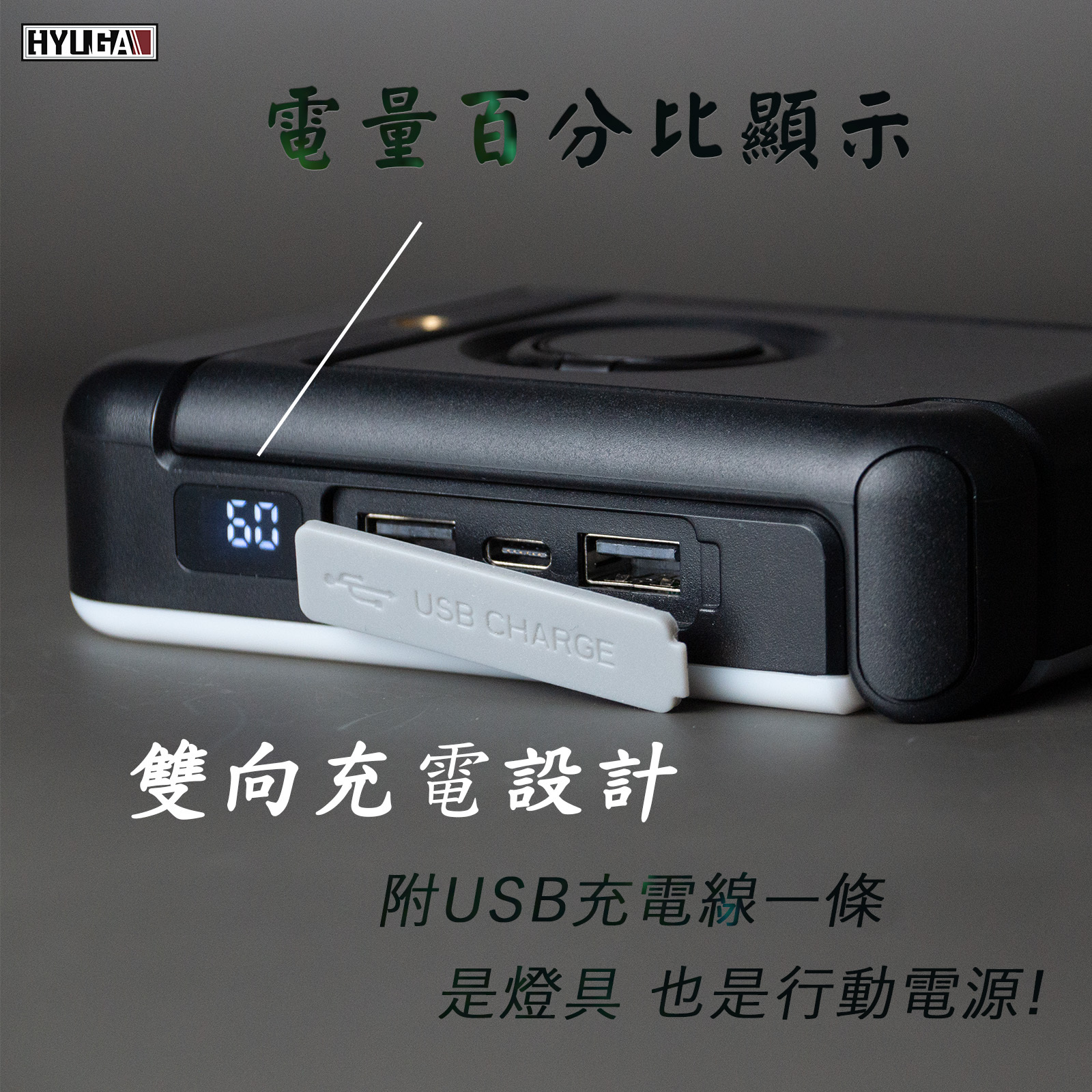 此款露營燈是一款具有超大容量的行動電源,配備專用USB-TypeC充電線,方便使用者進行充電。