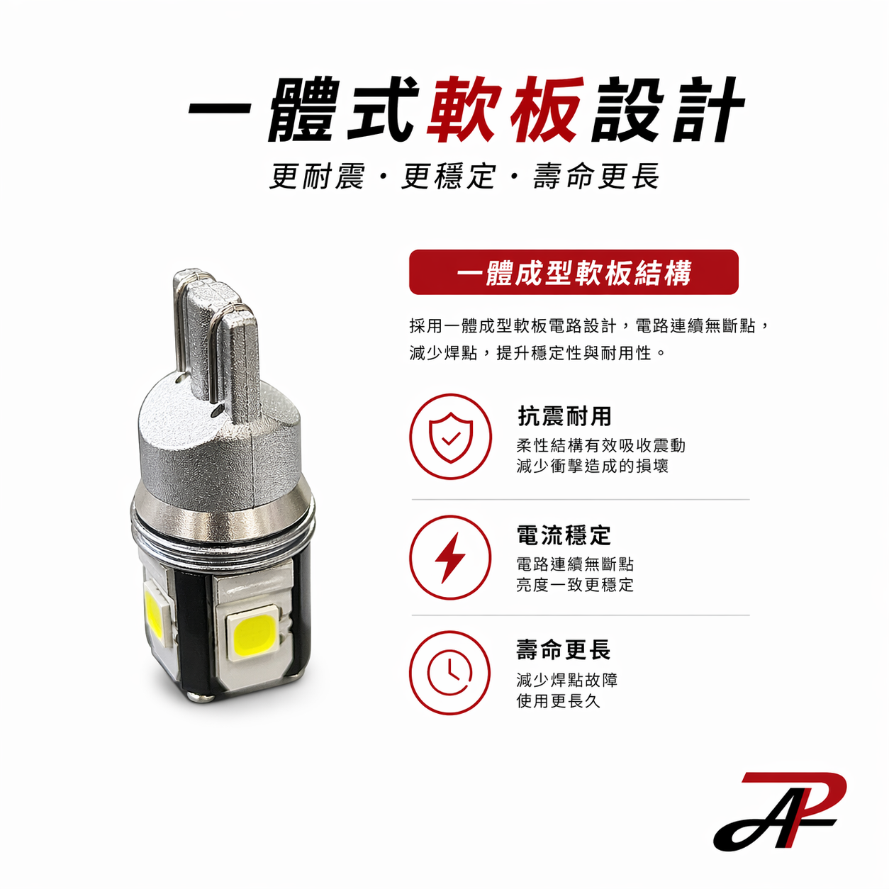 ✔ 一體式軟板設計:減少焊點・穩定耐震